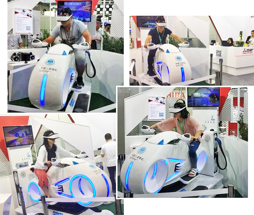 三菱展臺(tái)中這款廣州卓遠(yuǎn)幻影星空“樂享光輪”系列VR摩托正是采用邁信電氣身臨其境運(yùn)動(dòng)方案,方案配置邁信電氣專為VR行業(yè)開發(fā)的EPX動(dòng)感座椅版伺服系統(tǒng),該系統(tǒng)配置20路I/O資源,能夠充分滿足VR游戲的復(fù)雜特效需求,設(shè)備采用柔性運(yùn)動(dòng)控制、支持以太網(wǎng)總線協(xié)議,具有兼容性強(qiáng)、布線簡(jiǎn)單、系統(tǒng)穩(wěn)定等特點(diǎn)。