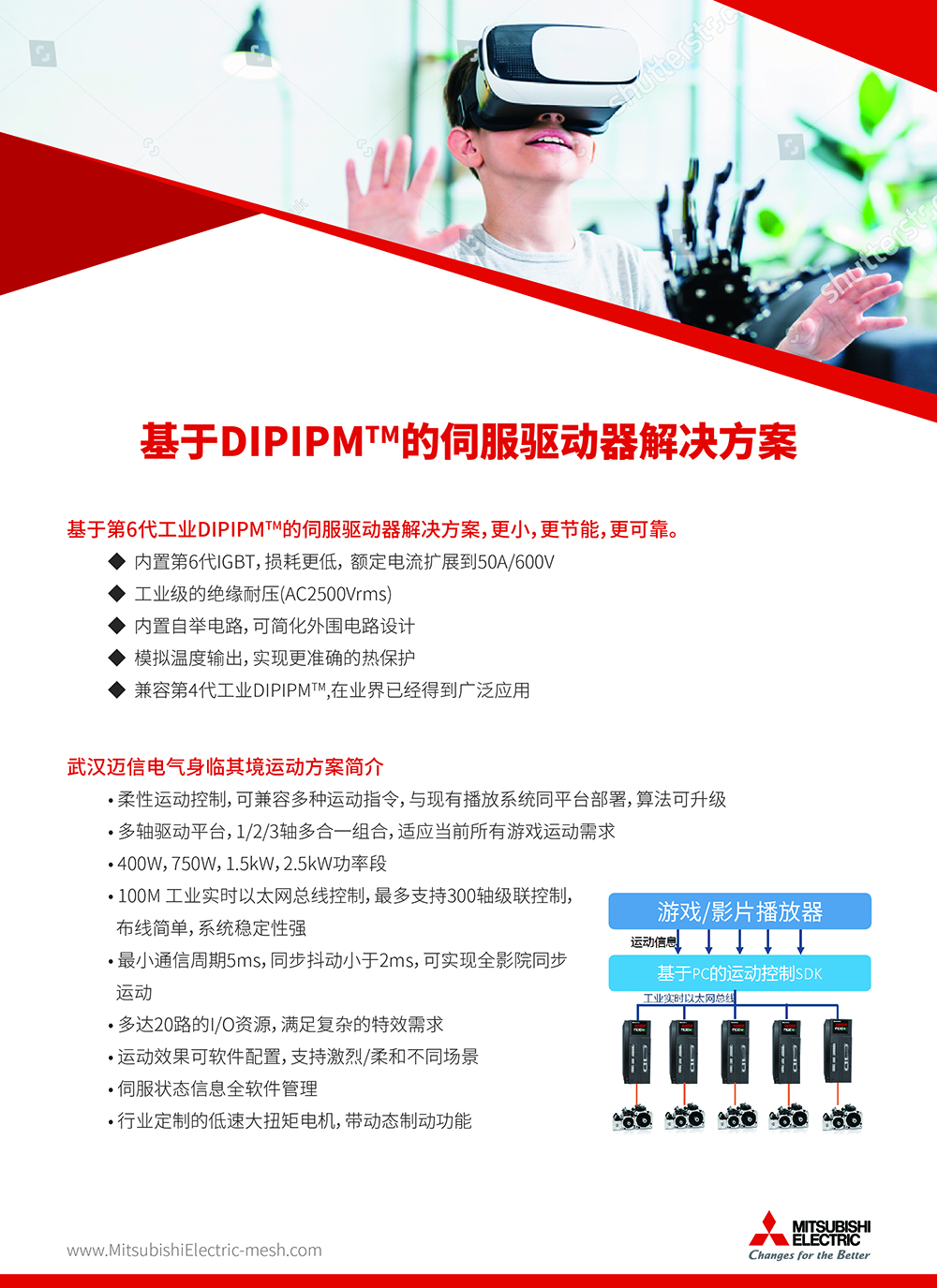 在硬件方面,邁信電氣身臨其境運(yùn)動(dòng)方案設(shè)備(可選)內(nèi)置三菱第6代工業(yè)DIPIPM™智能功率模塊,保證伺服系統(tǒng)體積更小、更節(jié)能、更可靠。