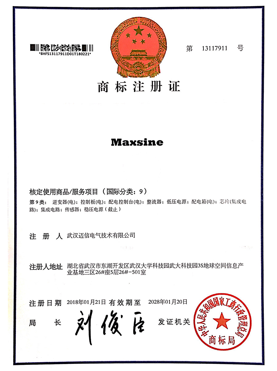 2018年1月21日,武漢邁信電氣技術(shù)有限公司Maxsine®英文商標(biāo)正式注冊。