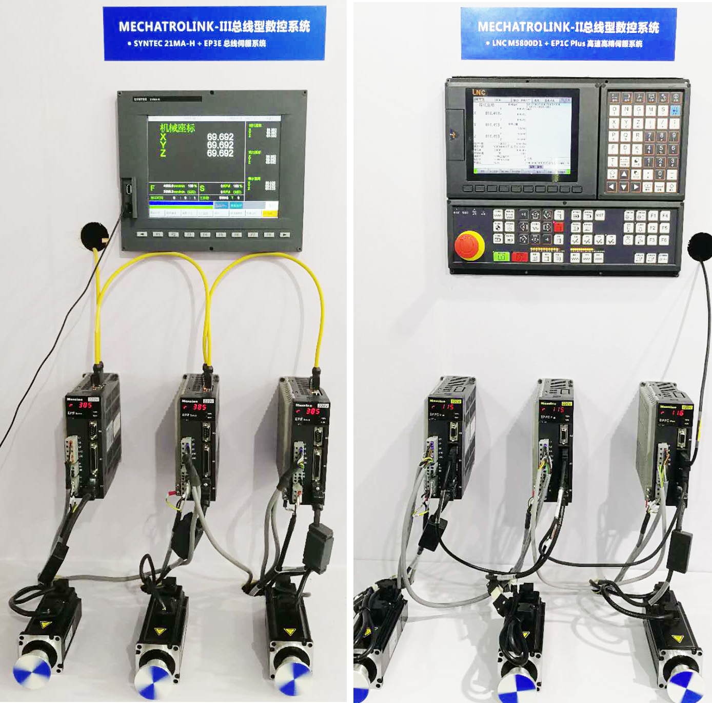 ▲ 左圖:MECHATROLINK-Ⅲ總線(xiàn)型數(shù)控系統(tǒng)(SYNTEC 21MA-H + EP3E總線(xiàn)伺服系統(tǒng)),右圖:MECHATROLINK-Ⅱ總線(xiàn)型數(shù)控系統(tǒng)(LNC M5800D1 + EP1C Plus高速高精伺服系統(tǒng))
