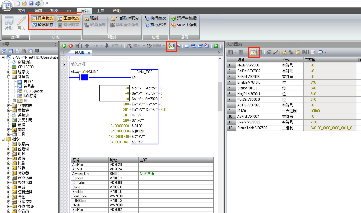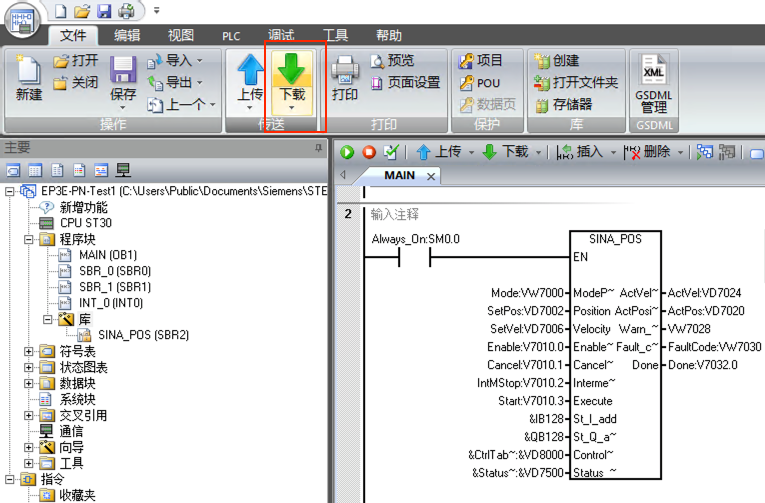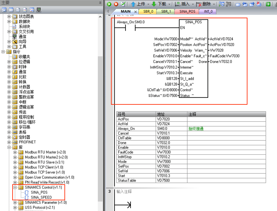 7. 主程序中編寫程序,SINA_POS功能塊的St_I_add和St_Q_add的地址與步驟5中111報(bào)文的輸入輸出地址對(duì)應(yīng)