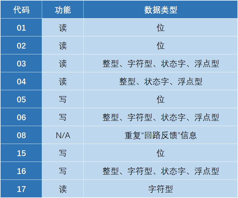 ModBus 功能碼與數(shù)據(jù)類型對應(yīng)表