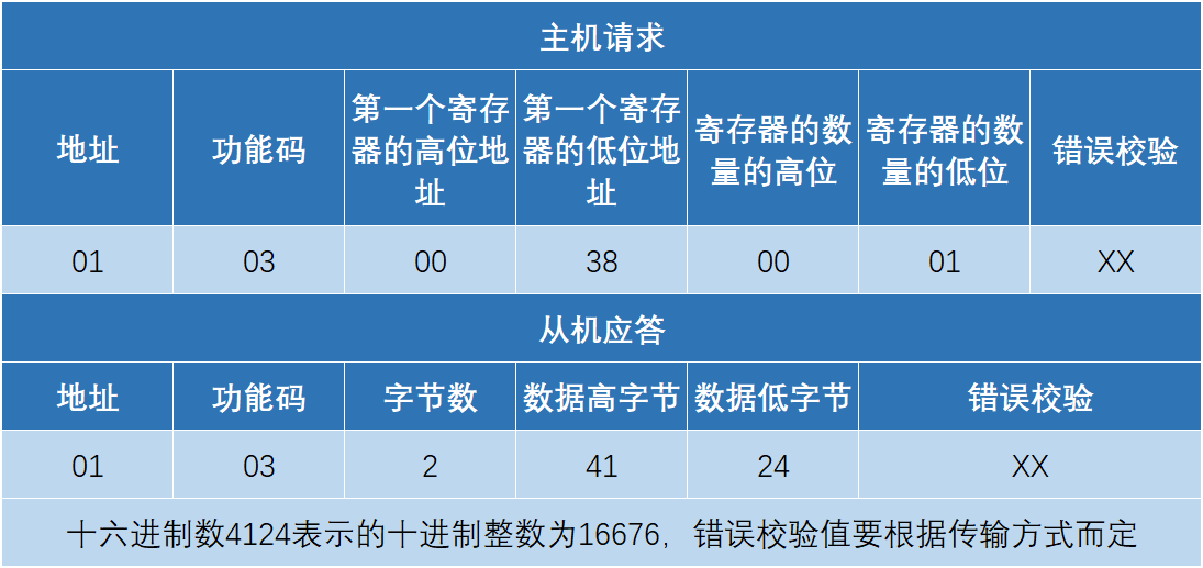 解析一下:主機(jī)發(fā)送指令,訪問從站地址為1,使用功能碼03(讀保持寄存器),起始地址高8位、低8位:表示想讀取的模擬量的起始地址(起始地址為0)。比如例子中的起始地址為38,十進(jìn)制為:56。寄存器數(shù)量高8位、低8位:表示從起始地址開始讀多少個模擬量。例子中為1個模擬量。注意,在返回的信息中一個模擬量需要返回兩個字節(jié)。錯誤校驗(yàn)為CRC校驗(yàn)。