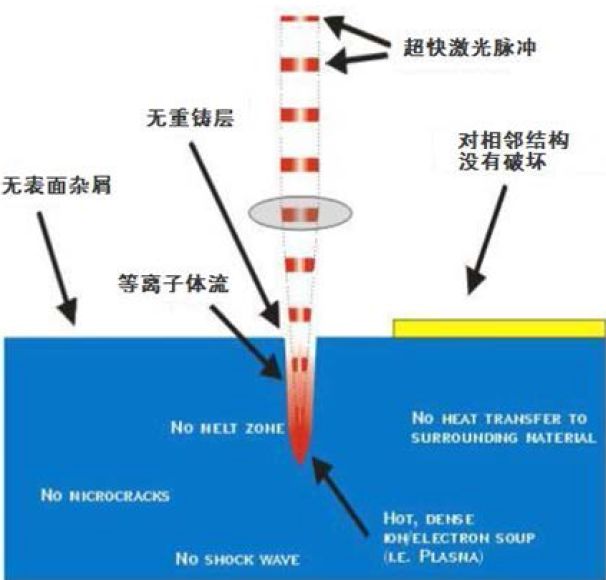 超短脈沖加工能量極快地注入很小的作用區(qū)域,瞬間高能量密度沉積使電子吸收和運動方式發(fā)生變化,避免了激光線性吸收、能量轉(zhuǎn)移和擴散等影響,從根本上改變了激光與物質(zhì)相互作用機制。