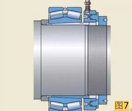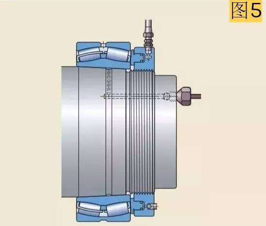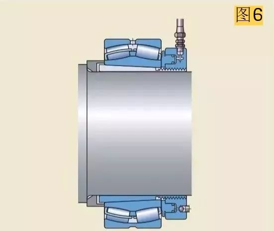 較大軸承需要更大的力來安裝,因此應(yīng)使用液壓螺母。液壓螺母可以把圓錐孔軸承安裝在圓錐形軸徑上(圖5),緊定套上(圖6),退卸套上(圖7)。