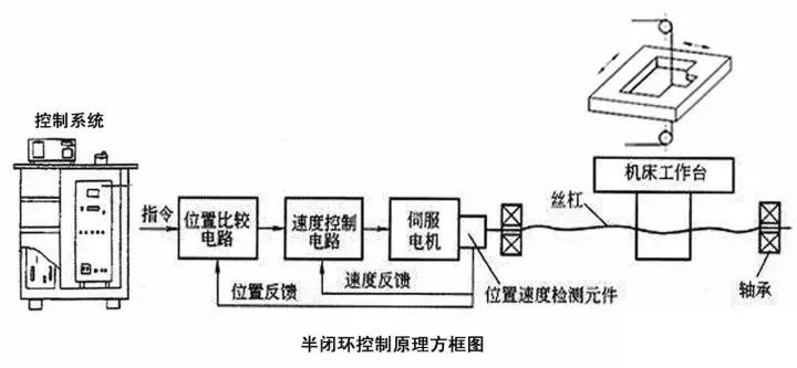 半閉環(huán)控制系統(tǒng)的工作原理和全閉環(huán)伺服系統(tǒng)相似,只是位置檢測器不是安裝在工作臺上,而是安裝在伺服電機的軸上的編碼器作反饋運動控制。
