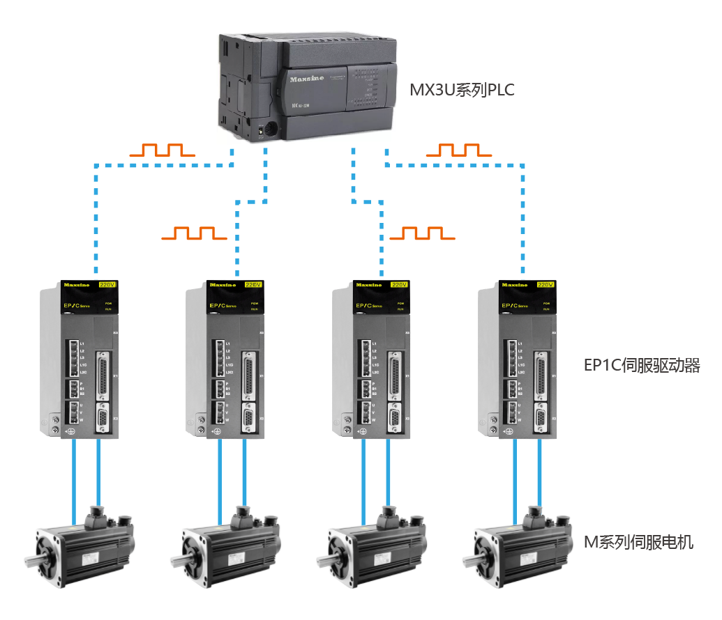 1、邁信PLC+4臺EP1C伺服驅(qū)動器+4臺邁信伺服電機