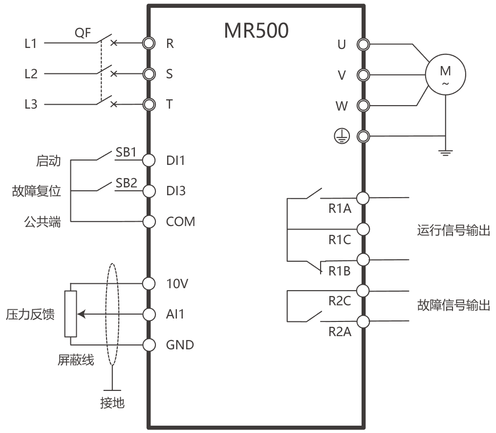 雖然水泵在低速運(yùn)行時(shí),電動(dòng)機(jī)的工作電流較小。但是,當(dāng)用戶的用水量變化頻繁時(shí),電動(dòng)機(jī)將處于頻繁的升、降速狀態(tài),而升、降速的電流可略超過(guò)電動(dòng)機(jī)的額定電流,導(dǎo)致電動(dòng)機(jī)過(guò)熱。因此,電動(dòng)機(jī)的熱保護(hù)是必需的。對(duì)于這種由于頻繁地升、降速而積累起來(lái)的溫升,變頻器內(nèi)的電子熱保護(hù)功能是難以起到保護(hù)作用的,所以應(yīng)采用熱繼電器來(lái)進(jìn)行電動(dòng)機(jī)的熱保護(hù)。